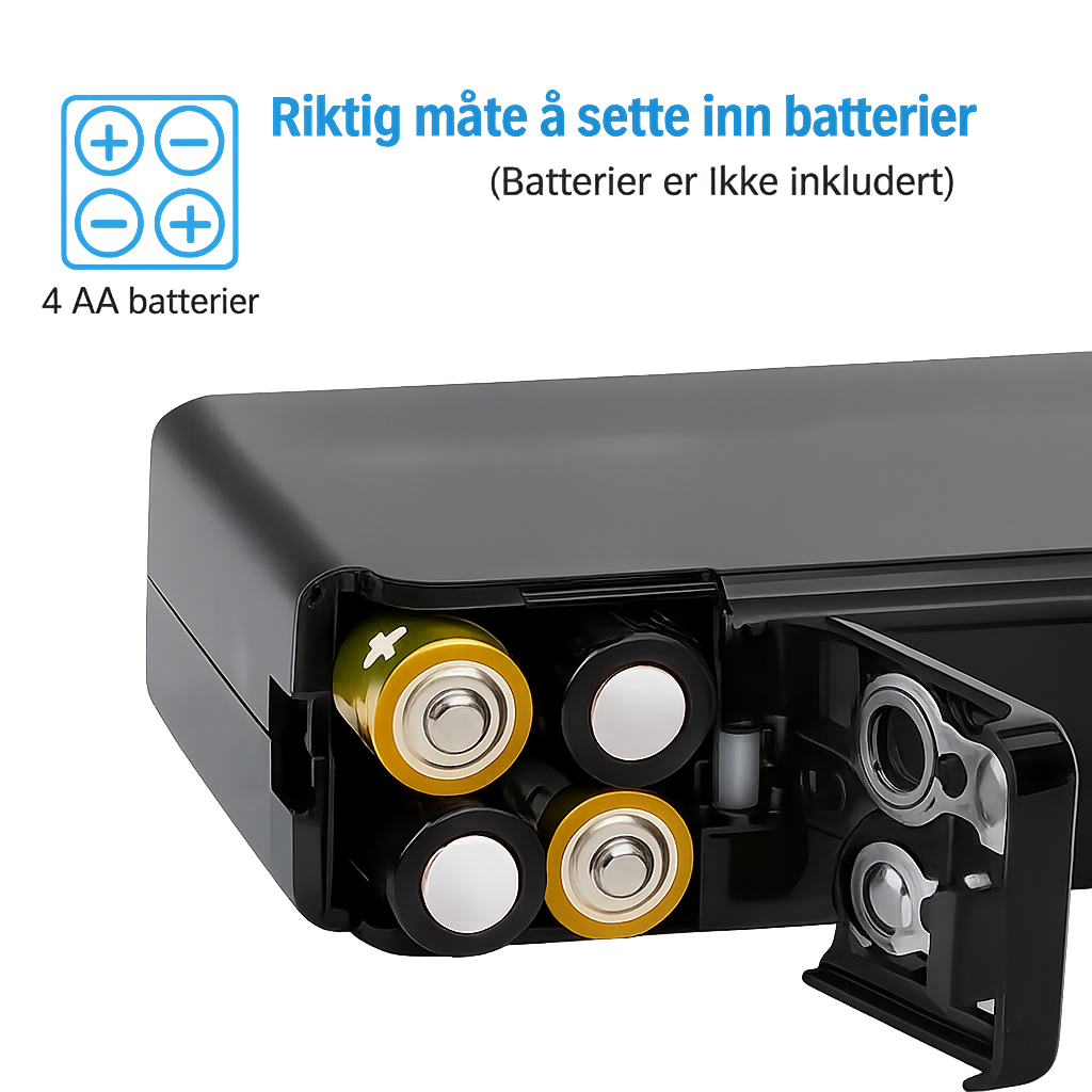 Drives av 4 AA-batterier (ikke inkludert) og er klar til bruk på få sekunder.